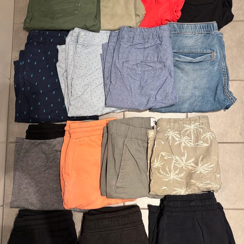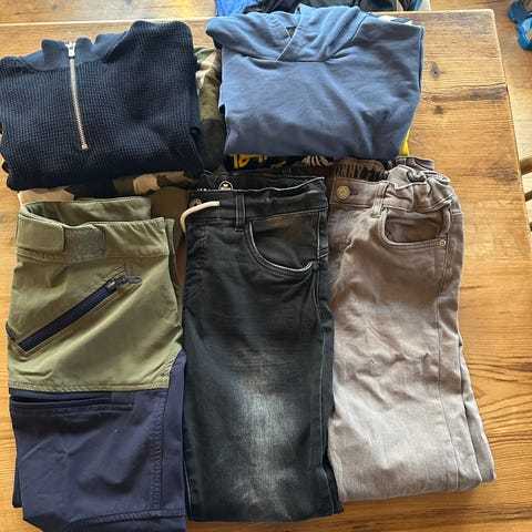 5 Jeans, 2 trenings shortser+ trenings T-skjorte, 1 turbukse, 4 bukser, 2 shortser, 1 genser, 1 joggebukse,.