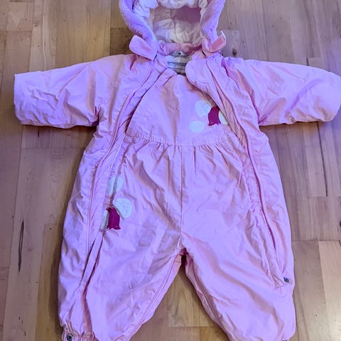 Reima Barneklær rosa dress i størrelse 68 for jente. Dressen har hette og lange ermer, laget for å gi komfort og beskyttelse til små barn.