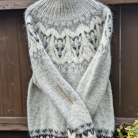 Oppskriften heter Nornegenser og har et stilig motiv inspirert av norrøn mytologi. Genseren er strikket i garnet Rauma Fivel som består av 100% ull fra norsk lam.