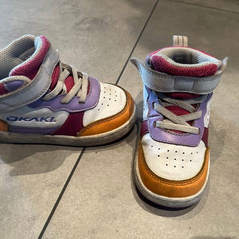 Okaki unisex barne sneakers i størrelse 25. Skoene har en flerfarget design med hvit, oransje, lilla og rosa detaljer. Med borrelås. Pent brukt.