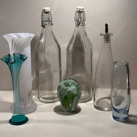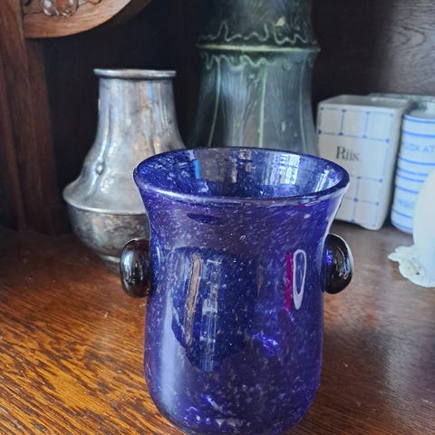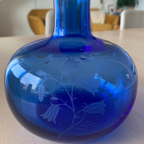 Glassvase i blått glass med gravert blomsterdekor, blåklokker, fra Magnor glassverk. Designet av Arne Lindaas. Vasen er feilfri og 20 cm høy.
