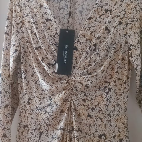 Ilse Jacobsen kjole i størrelse L, beige farge med mønster. Kjolen har lange ermer og er laget for kvinner. Kommer med underkjole. Lekker på.
