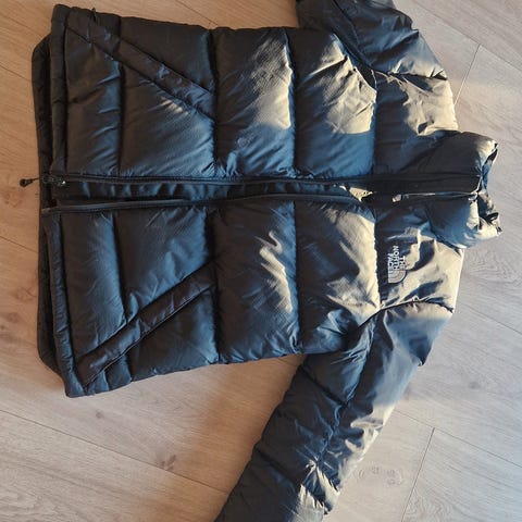 Denne vinterjakka kan man bruke begge sider på, enten hvit eller blå. Det står XL Filles, som er en stor jentestørrelse, som da passer en dame Xs-S.