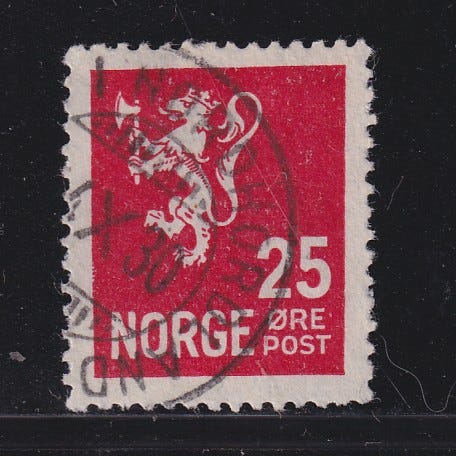 NK 208. Løve III med øks 1937. Utgitt 12-10-1937. Bildestørrelse 21x17mm. 35 øre fiolett. Par.