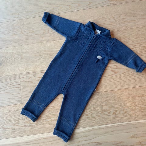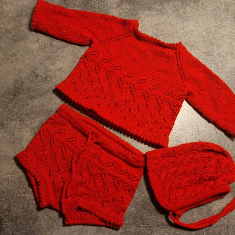 Helt ubrukt sett med hjemmestrikket sett bestående av «rumpert» og lue i 100% merinoull.