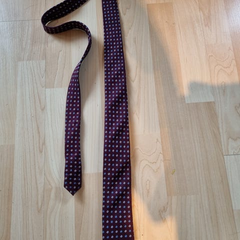Trussardi herre slips laget av 100 % silke. Slipset har et blått mønster med innslag av oransje og beige. Produsert i Italia. Bredden på tuppen er 9 cm.