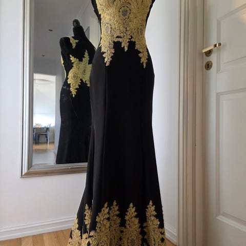 Kjolen er i 100% Silke, den er foret og har sorte blondedetaljer. Det er innlegg i bysten.
