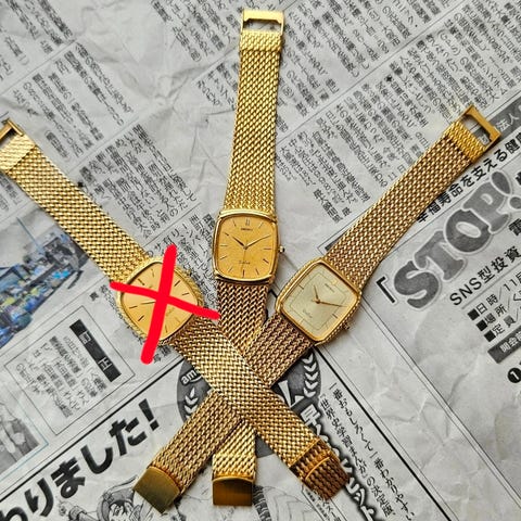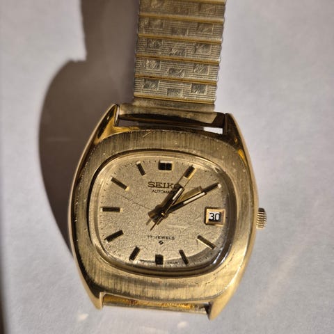 Seiko Quartz herreklokke med kvadratisk gullfarget urskive og brun skinnrem. Klokken har datovisning og analog visning med time-, minutt- og sekundviser. Urskiven har et mønster med vertikale linjer. Klokkens bakside viser modellnummer og serienummer.