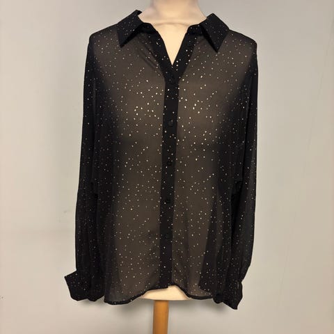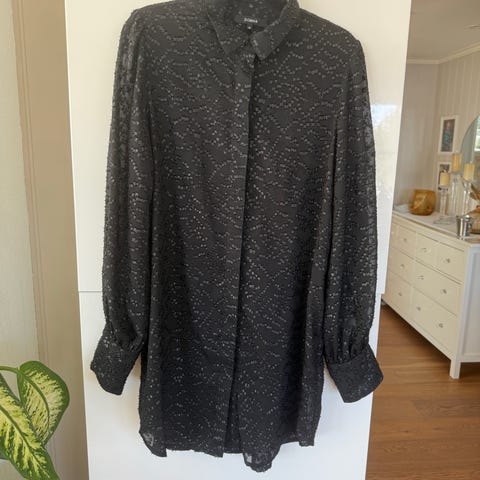 Ny og flott paljett bluse fra Haust. Blusen er foret, og er sidere bak enn foran. Den har mansjetter på ermene.