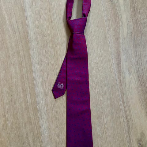 Hermès Vintage slips laget av 100 % silke i mørkeblå farge med hvite detaljer. Slipsen har et subtilt mønster og er merket med Hermès-logo både på utsiden og innsiden. Bredden på tuppen er 9,5 cm.