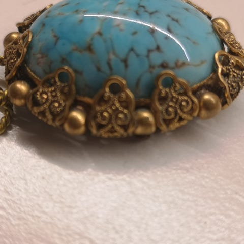 Vintage gullfarget anheng med en brun stein i midten, designet med flere buede gullrammer som omgir steinen. Anhenget er festet til et gullfarget kjede. Anhenget er stemplet med double.