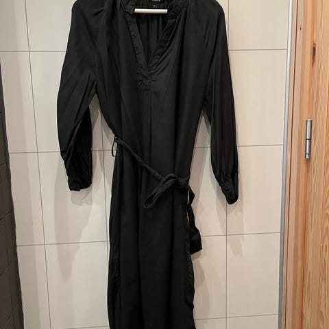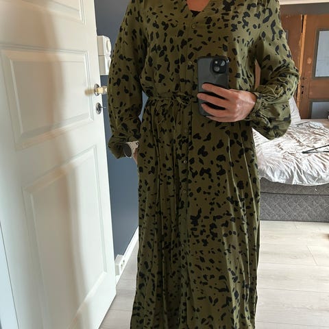Kjempefin kjole med knapper hele vegen foran, lommer i sidene og knyting i livet.