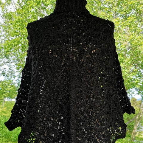 Selger en hjemmestrikket poncho i ullblanding, mest mohair. Den er noe asymmetrisk, og har en bredde på rundt 71 cm og lengde på rundt 60cm. Den er i ulike grønnfarger, men fremstår som mørk mosegrønn. Ikke blitt bruk. Størrelse er M. Den har fine detaljer i halsen og rundt bolen. Halsen er avrundet.