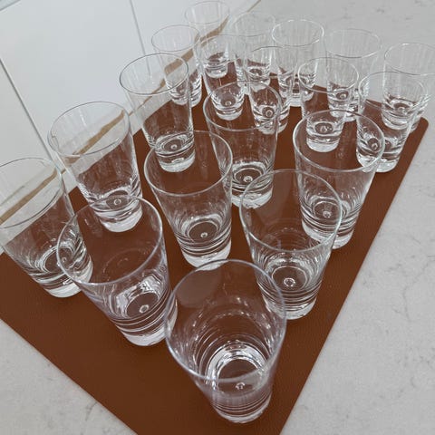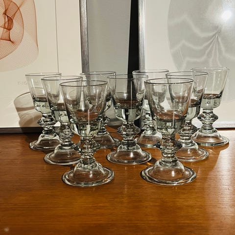 Hadeland Glassverk Tangen glass, sett med 12 stk. 6 stk store, hvor 1 har en liten sprekk (nesten ikke synlig og lekker ikke), og 1 er litt matt (ikke synlig når våt, mulig kan fikses med glansemiddel). De 6 mindre glassene er i perfekt stand. Glassene er laget i klart (litt sotet) glass og har en klassisk design med stett. Egnet til servering av vin eller andre drikker.
