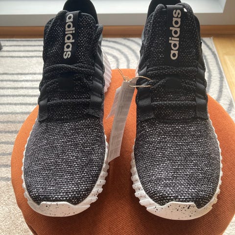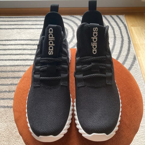 Litt slitt av den blå fargen på S I Adidas på bånnet på toppen av skoen. Vanlig slitasje under skoene etter bruk, sålen inni har gnisset av påtrykt cloadfoam merke på sålen inni skoen. Myk og god på foten.