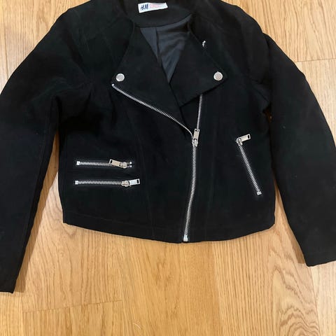 H&M jakke for barn i størrelse 140. Jakken er svart og laget av et mykt, pelslignende materiale. Passer for jenter.
