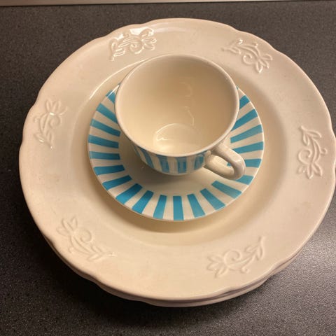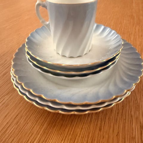 Blått sett med kaffekopp: kopp høyde 7 cm, diameter 9 cm, skål diameter 15 cm, Asjett diameter 20,5 cm. Koppen har litt krakelering på utside, og en bitteliten avskalling på kanten, skål og asjett har ingen krakelering, men noe bruksslitasje, spesielt asjetten (se bilder).