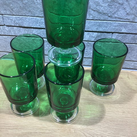 Grønne vintage Luminarc France stett glass i flere størrelser. Se mål på bildene Alle er i fin stand. Selges 50kr pr stk.
