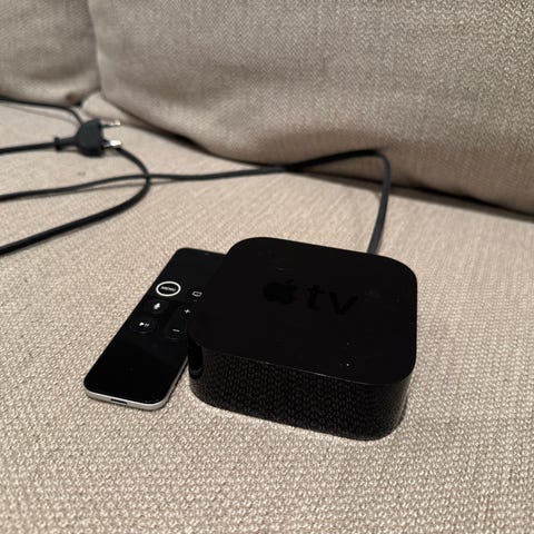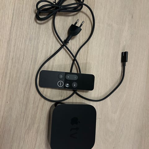 Apple Apple TV Mediespiller med fjernkontroll og HDMI-kabel. Enheten har et svart kabinett med Apple TV-logo. Inkluderer fjernkontroll med knapper for meny, volum, avspilling og stemmestyring. HDMI-kabel følger med for tilkobling til TV.