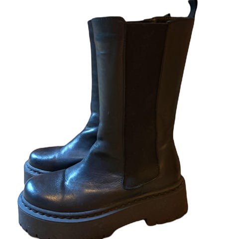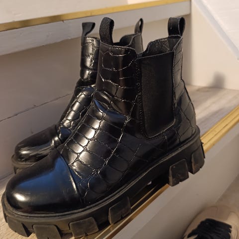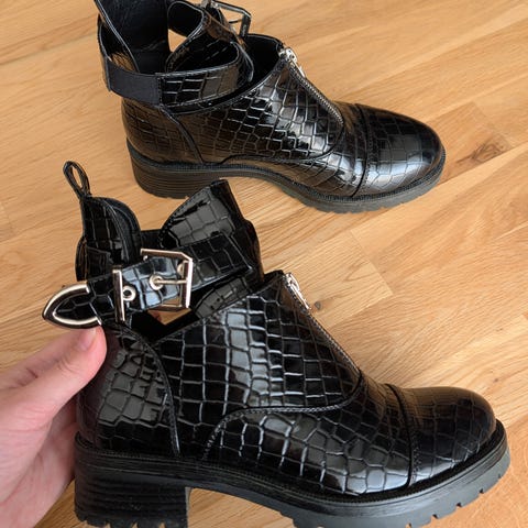 Bianco Støvler i størrelse 36 for dame. Støvlene har en svart farge med en tekstur som etterligner krokodillemønster. De har glidelås og spenne som lukkemekanismer, samt en solid såle med godt grep.
