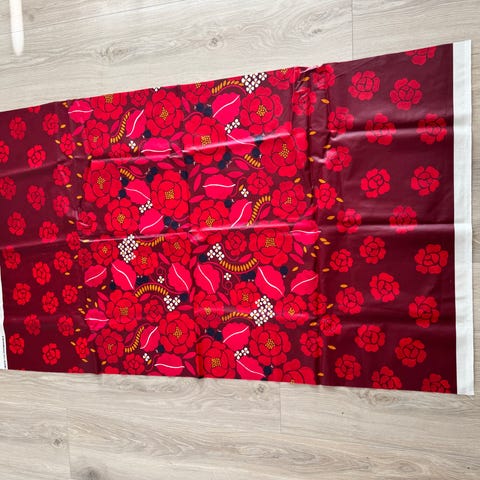 Marimekko oyj suomi- Finland Maija Isola 1958/k.l 2007: Festivo bomullsstoff med rødt og gull fargede blomstermønster. Stoffet har dimensjonene 150 cm x 140 cm. Virkelig lekkert, skinner