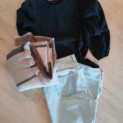 *Sort, figursydd blazer med lange ermer, UK str 12 (tilsvarer str 40). Opplever den som litt liten i størrelsen. Vil si den tilsvarer en vanlig M/38. Kort modell. Jeg er 160cm og blazeren rekker meg til hofta. Klassisk og fin jakke.