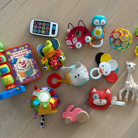 Samling med ulike rangler, leker og biteleker selges samlet.