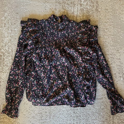 Deilig bluse i fine høstfarger. Pene detaljer. Strikk i vaffelsøm på armene og brystpartiet. Strikk nede. Armene er gjennomsiktige, resten er foret.