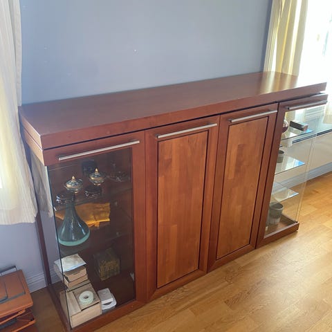 Fin og praktisk skjenk med tre felt. To glassdører med to hylleplater i hvert felt. Fire gode og solide skuffer. Rommer mye. Har en liten vannskade, se bilde, tror denne er mulige fjerne med litt fin pussing. Skygge på noen av bildene er årsak til mørk stripe på skuffene.