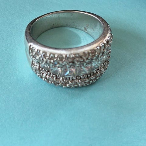 Søkeord: ring, stor ring, statementring, rektangulær stein, sølvfarget, klar stein, vintage stil, smykke, fest, kostyme, glam, unikt design