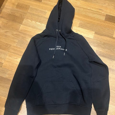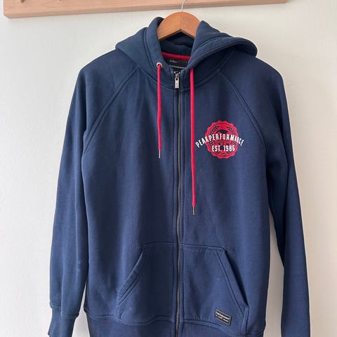 Peak Performance hettegenser i mørkeblå, størrelse L for damer men vil si den er mer S/M. Genseren har hette med snøring og kengurulomme foran. Materialet og passformen er tilpasset for komfort og bruk i ulike sammenhenger.