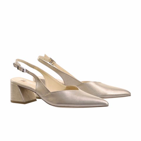 Beige pumps i coated kvalitet med spiss tå, smal trukket hæl og smal regulerbar hælreim med metallspenne, Hælhøyde 7 cm.