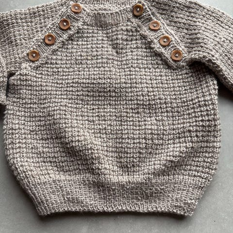 Håndstrikket genser for barn i størrelse 116. Genseren er unisex og laget i beige ullmateriale. Den har knapper med dyremotiv (katt) på fronten og et strukturert mønster i strikkingen. Passer til daglig bruk og gir varme.