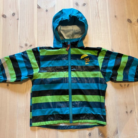 Polarn O. Pyret barnejakke i størrelse 104, egnet for barn i alderen 3-4 år. Jakken har svart kropp med grønne ermer og hette. Den er laget for unisex-bruk og har glidelås foran. Jakken er laget av lett materiale, egnet for utendørs bruk.