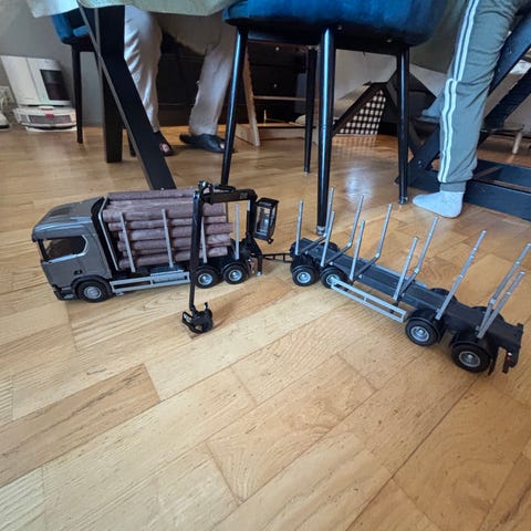 Emek Stylist lastebiltrailer leketøy med landskapsdekor på siden. Laget i metall, hvit farge med detaljer i svart og fargerik landskapsillustrasjon. Passer for barn som samler eller leker med modellbiler.