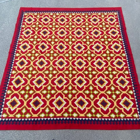 Juledekorasjon i form av en stjerne laget av rødt stoff med detaljer i gulltråd.