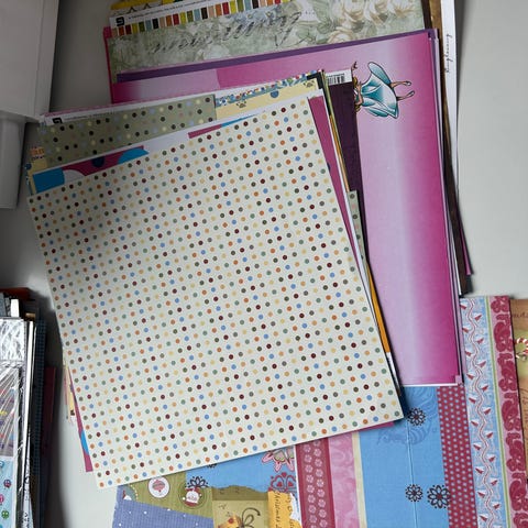 Pakke med ulike typer papirark inkludert mønstrede designpapir, glitter kartong og ensfargede ark. Arkene har forskjellige farger og mønstre, egnet for hobbybruk som kortlaging, scrapbooking og andre papirprosjekter.