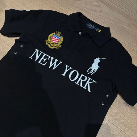 Ralph Lauren Polo Miami herre polo skjorte i størrelse M. Skjorten er hvit med svart krage og detaljer, laget i bomullsmateriale. Den har trykk med nummer 5 på ryggen og broderte logoer på forsiden.