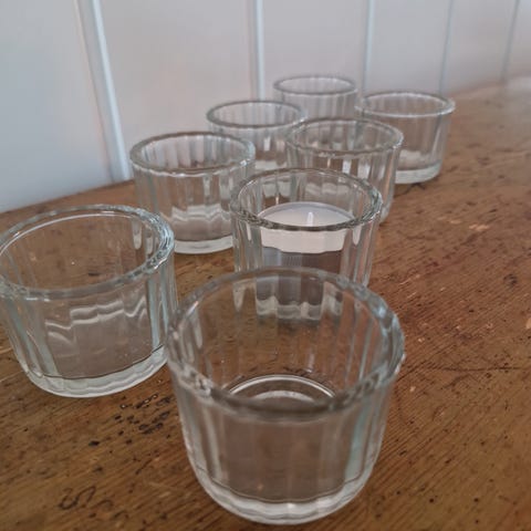 8 stearinlys/telysholdere (NB, kan brukes til begge deler, men dersom man bruker stearinlys bør man bruke lysmansjetter i for at de skal sitte,kun prøvd med ikea sine stearinlys)