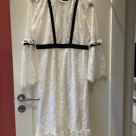 Blondekjole, nydelig modell, byTiMo. Kan være også festkjole i størrelse L, svart farge. Kjolen er laget i et blondermateriale med lange ermer og dekorative knapper foran. Passer for kvinner og egner seg til festlige anledninger.
