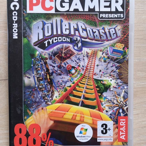 Atari World of RollerCoaster Tycoon PC spill. Spill for datamaskin med tema rundt fornøyelsesparker og berg-og-dal-baner. Produktet inkluderer spilldisk og original emballasje, med noe slitasje på esken. CDene er omtrent ubrukt.