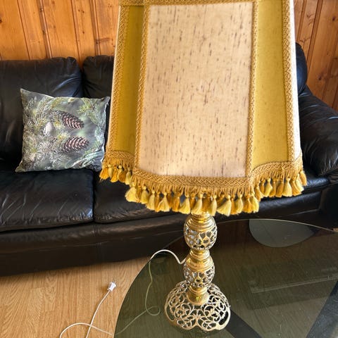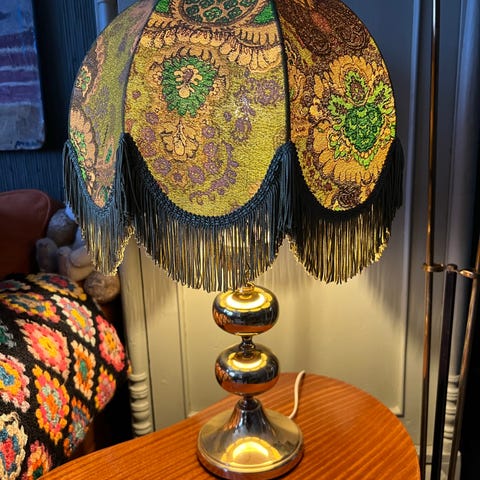 Lampens base er i tung messing med ekte patina, og skjermen har originalt blomsterstoff med frynser – et typisk uttrykk for perioden.