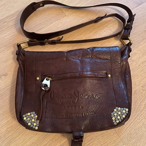 Mørk blå med brune skinndetaljer og tøff Pepe Jeans London-logo.