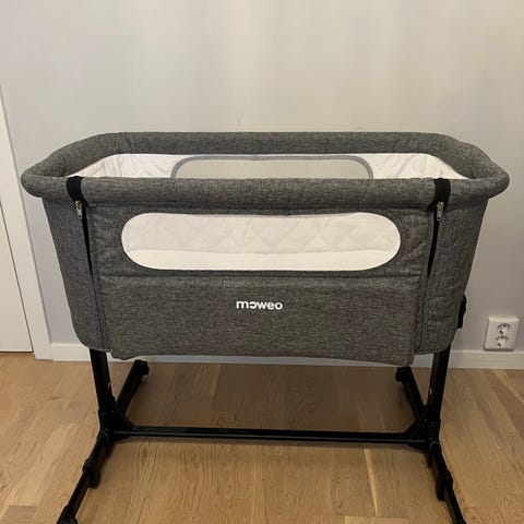 Fin, praktisk bedside crib fra Moweo med en myk, polstret madrass og oppbevaringsveske.