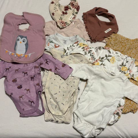 11 bukser, 6 pysjamaser/heldresser, 10 langermede bodyer (obs. noen synlige flekker på et par av de lyse bodyene), 1 fleecedress, 1 bukse-/jakkesett i bomull/akryl, 1 capslue, 2 kortermede heldresser, 1 kortermet body, 2 cardigans, 1 vest og 1 kortermet skjorte.