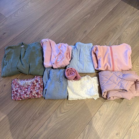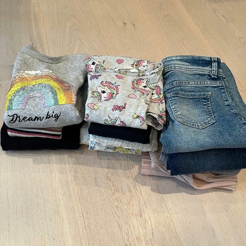 Selger en klespakke til jente i størrelse 122 / 128 . Ingen hull observert. Flekker og tusjmerker kan forekomme .