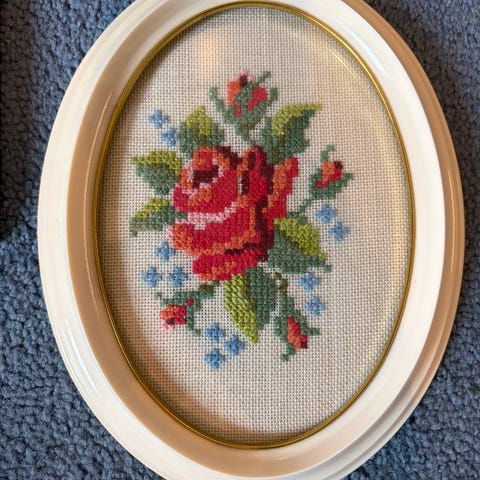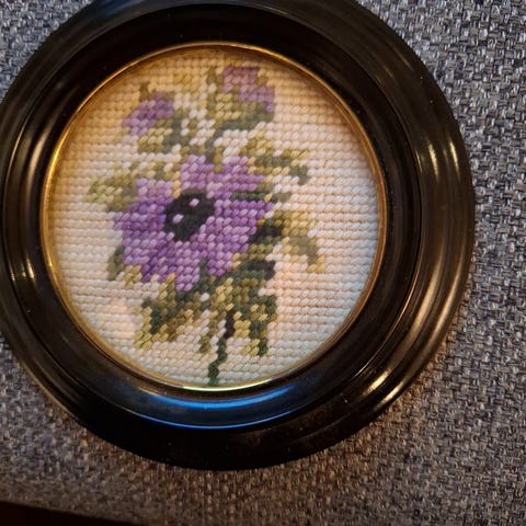 To pene broderier i rammer, selges samlet for kr 400 eller kr 250 per stykk. Mål: 24 cm x 19 cm.