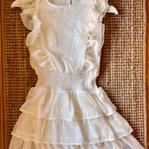 Søkeord: kjole, volang, sommerkjole, barn, jente, str 110, beige, bomull, barneklær, fest, hverdag, søt, vintage-stil, nøytral farge
