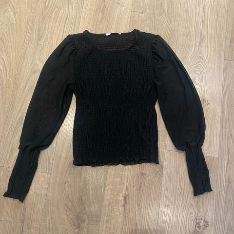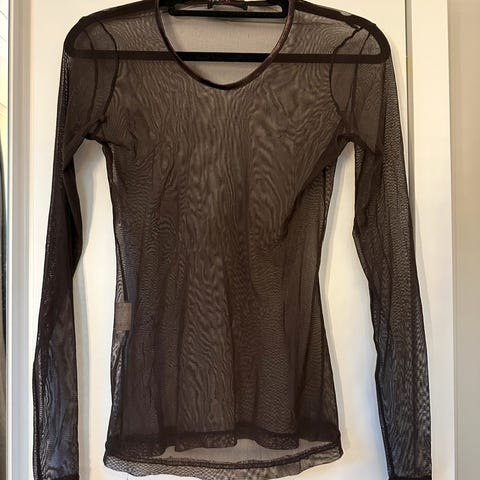 Ubrukt topp, gjennomsiktig i mørk blå. Snøring nederst. Vide ermer.