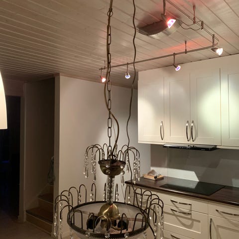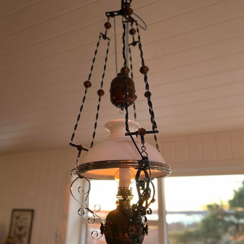 Taklampe med antikk utseende i børstet messing. Lampen har 3 lysestaker med prismeheng og hvit glasskuppel.